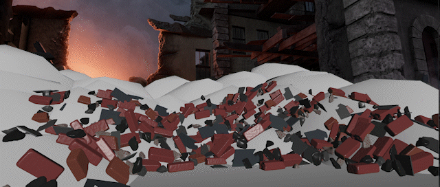 Here is the breakdown of the VFX work I contributed to the project, which includes pyro smoke, ashfall particle effects, and RBD debris piles.